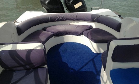 A spacious canopy speedboat offering comfort and protection for larger groups.